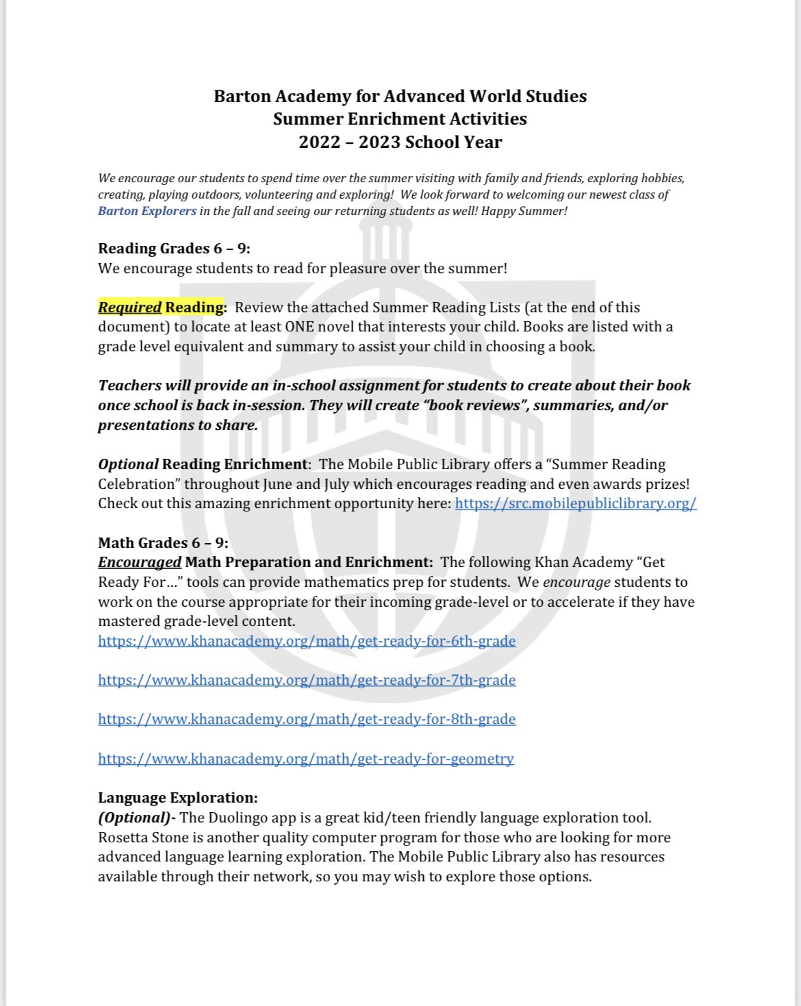 Barton Academy For Advanced World Studies On Twitter Happy Summer Rising Sixth Grade Summer Reading And Enrichment Info Is Attached Bartonexplorers Https T Co Pyeg0fgkn4 Twitter
